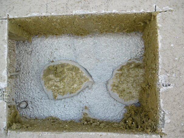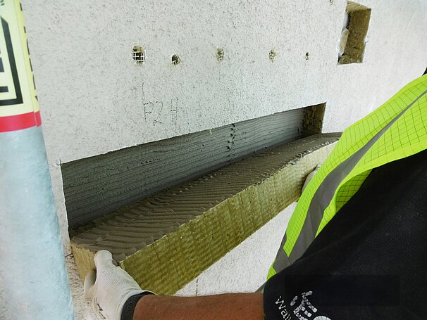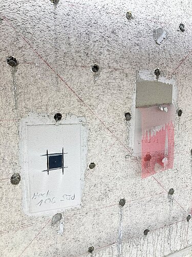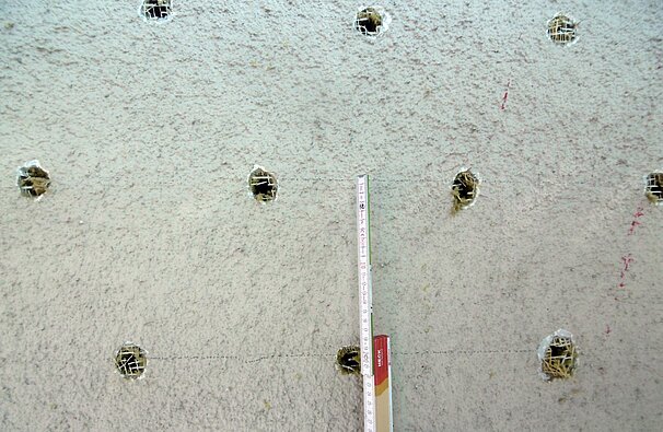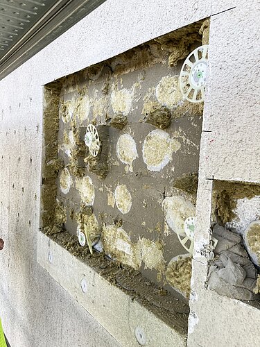 Vor der Frage des kompletten Rückbaus oder einer Sanierung des Alt-WDVS fiel die Entscheidung zugunsten einer innovativen Methode: der nachträglichen Verklebung des Altsystems durch Hinterfüllung. Hierbei wurde ein speziell entwickelter Klebemörtel über Bohrlöcher in das vorhandene Dämmsystem injiziert, sodass er sich hinter der bestehenden Mineralwolle-Schicht gleichmäßig verteilt und Hohlräume verschließt. Dies sorgte für eine deutlich verbesserte Haftung der Altdämmung am Untergrund.