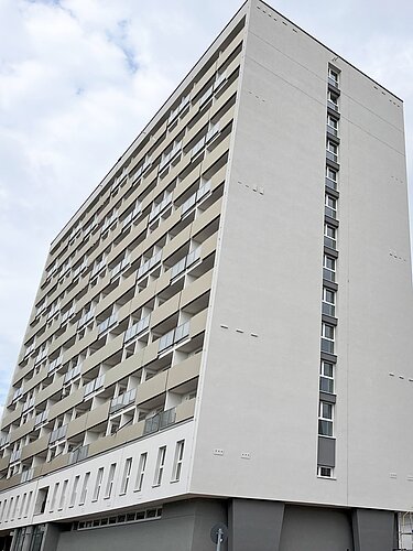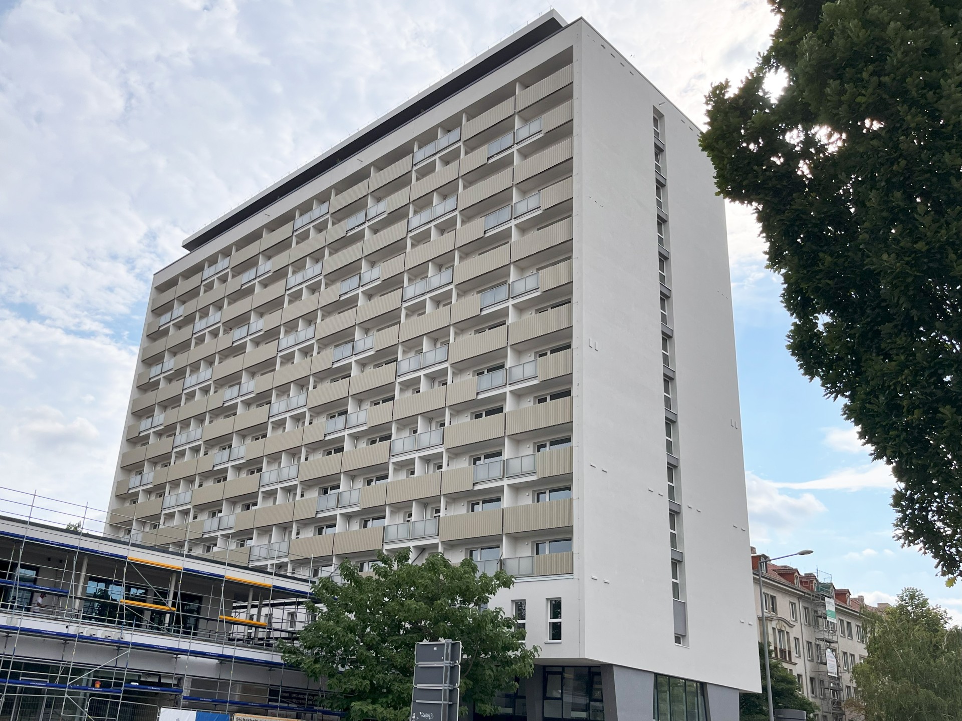 Am Pirnaischen Platz in Dresden wurde kürzlich eine der spannendsten Sanierungsmaßnahmen der Stadt abgeschlossen: Ein 14-geschossiges Hochhaus aus den 1960er-Jahren wurde einer umfassenden Modernisierung unterzogen. Die Herausforderung war groß: Neben einer kompletten Neugestaltung des Innenraums mit 150 modernen Wohneinheiten sowie Gewerbeflächen im Erdgeschoss stand vor allem die Sanierung der 43 Meter hohen Außenfassade im Fokus.