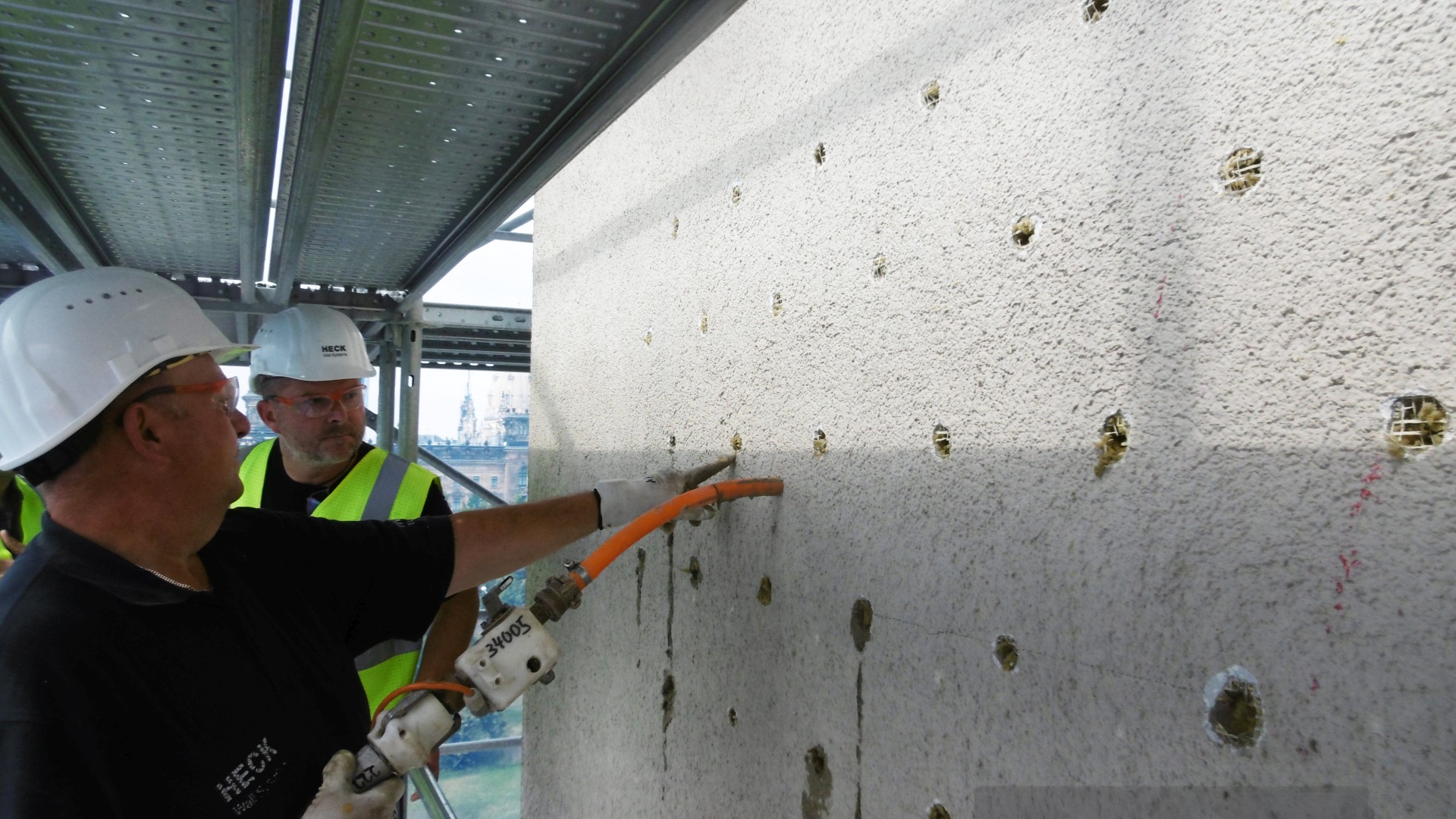 Vor der großflächigen Anwendung wurden mehrere Testflächen angelegt, um die Wirksamkeit der Methode nachzuweisen. Auf definierten Abschnitten der Fassade wurden Bohrlöcher mit exakt bemessenen Abständen eingebracht und der Klebemörtel HECK K+A Fill injiziert. Nach dem Aushärten folgten umfangreiche Prüfungen, darunter Haftzugmessungen und Gewebeabrisstests. Die Ergebnisse waren durchweg positiv: Die nahezu vollständige Hinterfüllung sorgte für eine erhebliche Verbesserung der Tragfähigkeit des Altsystems.