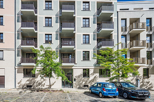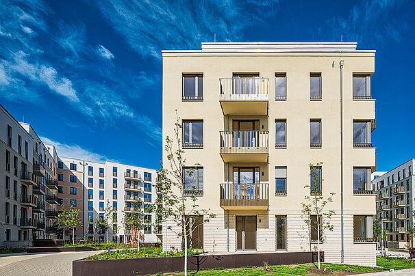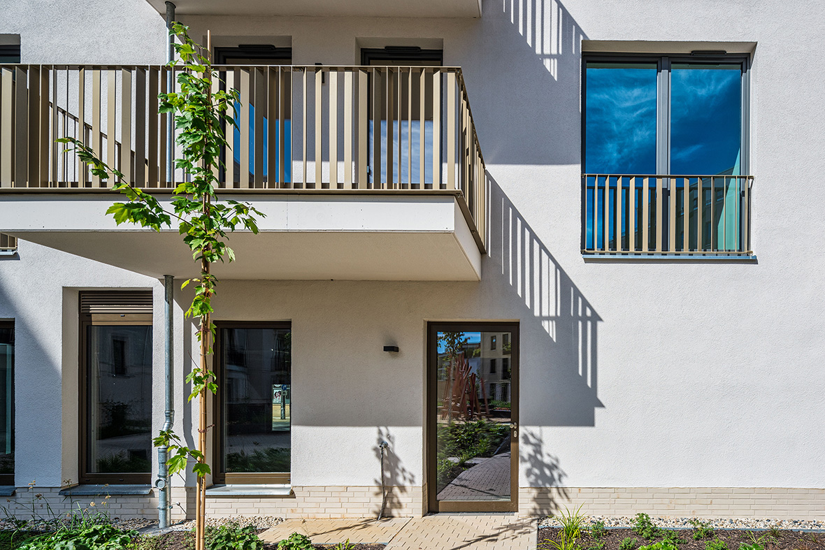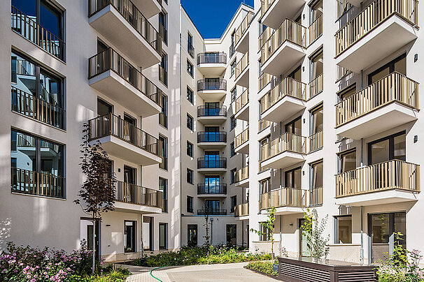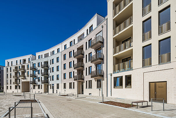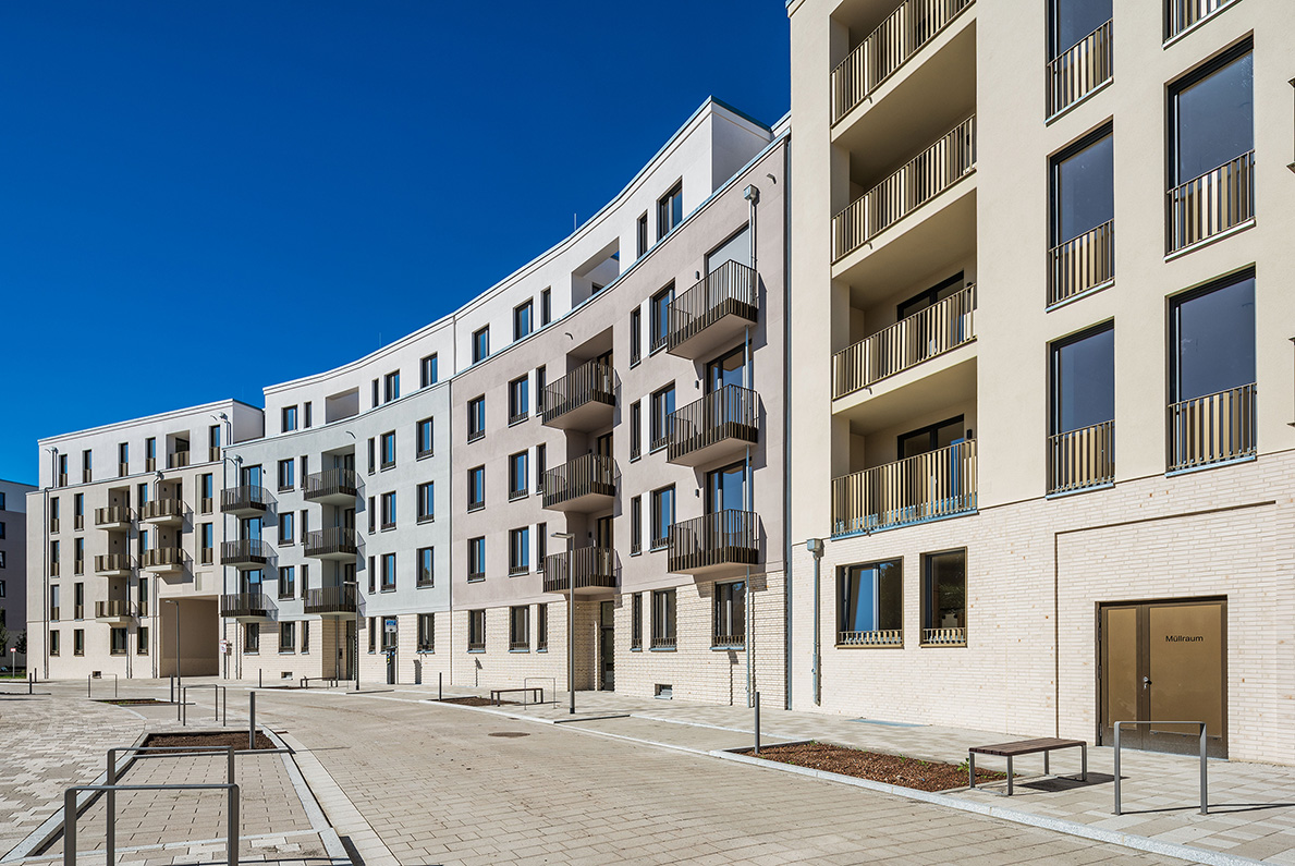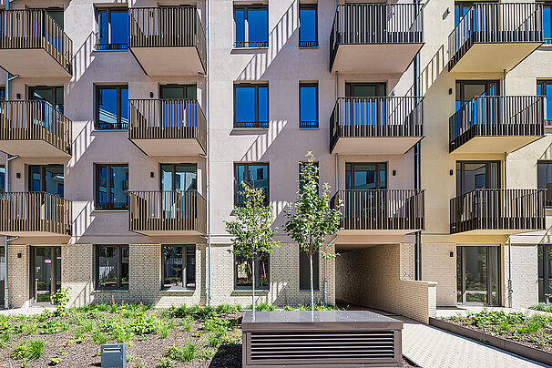Die moderne Wohnanlage enstand auf Basis eines energieeffizienten Fassadenaufbaus mit Mineralwolle-Dämmplatten. Nach der Montage der Dämmplatten als durchgehende Wärmedämmschicht wurde die Fassade gestalterisch zweigeteilt: In Teilbereichen kam ein klassischer Putzaufbau mit Armierung und Oberputz zum Einsatz, in anderen Zonen wurden Klinkerriemchen aufgebracht.