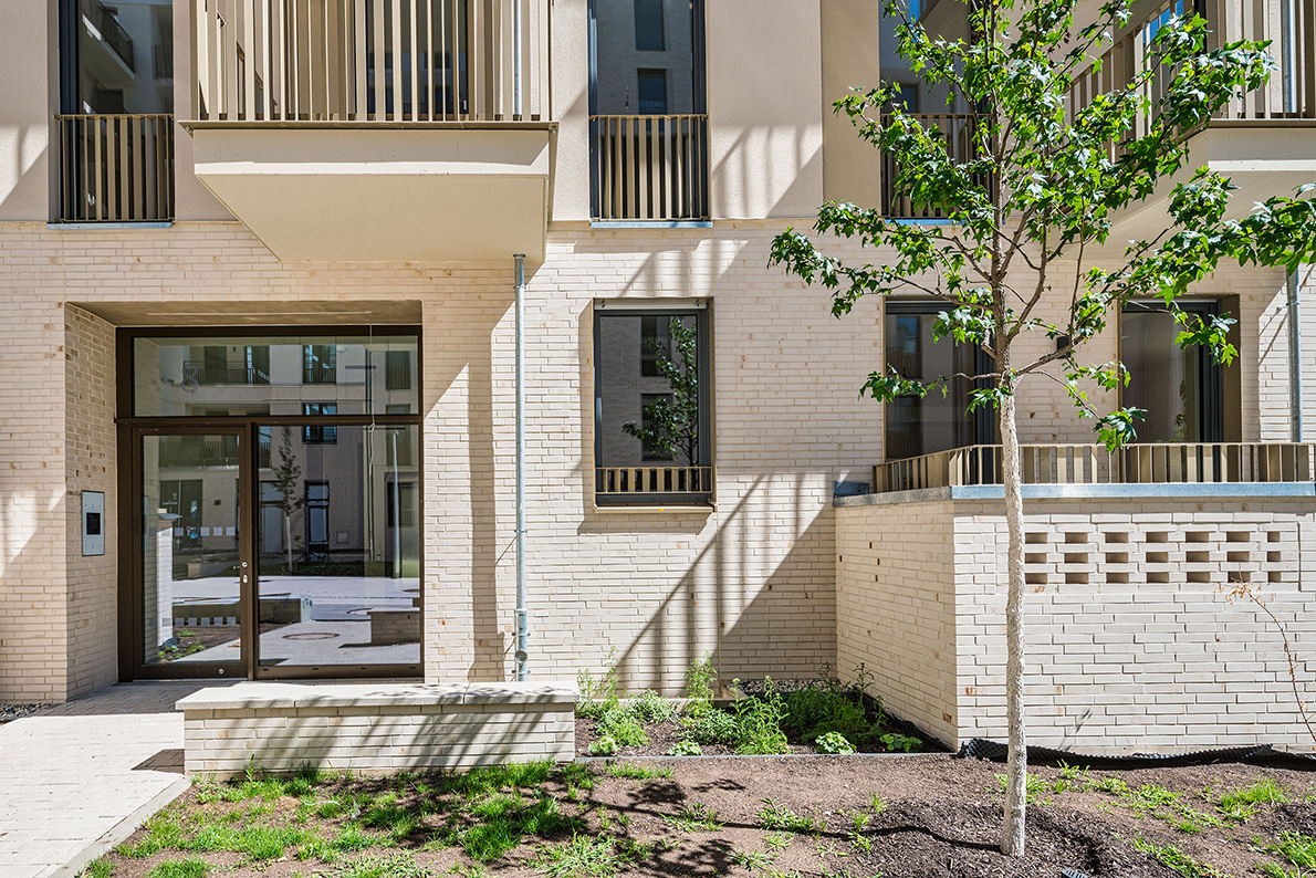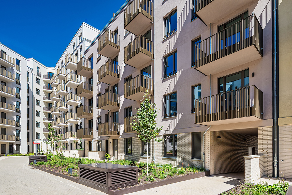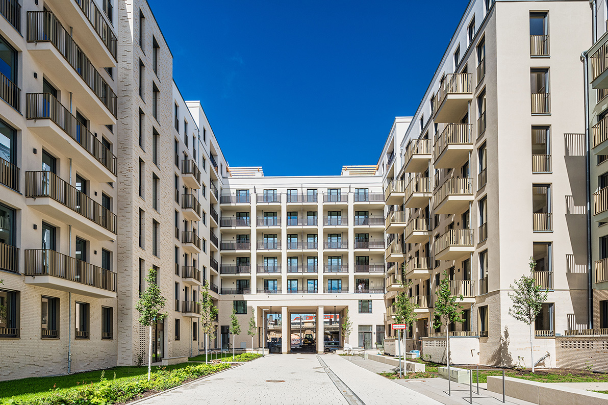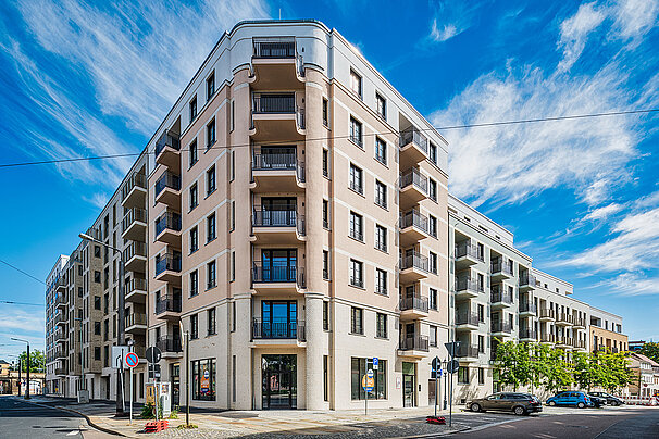 Die moderne Wohnanlage enstand auf Basis eines energieeffizienten Fassadenaufbaus mit Mineralwolle-Dämmplatten. Nach der Montage der Dämmplatten als durchgehende Wärmedämmschicht wurde die Fassade gestalterisch zweigeteilt: In Teilbereichen kam ein klassischer Putzaufbau mit Armierung und Oberputz zum Einsatz, in anderen Zonen wurden Klinkerriemchen aufgebracht.